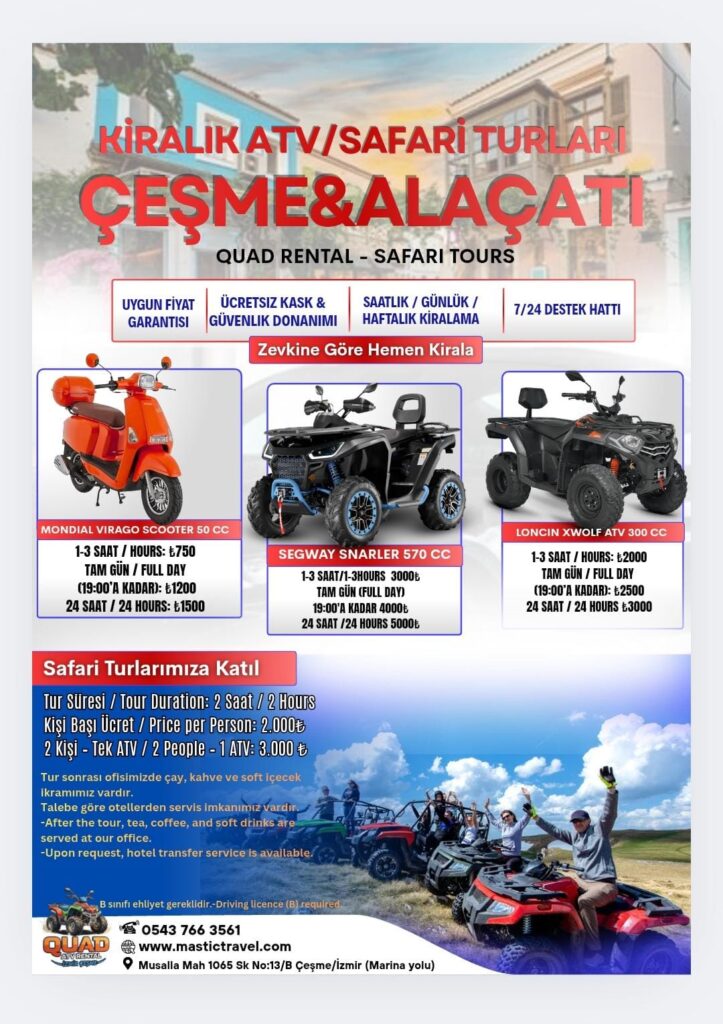 Çeşme ve Alaçatı bölgesinde kiralık ATV, quad ve safari turları ile adrenalin dolu bir deneyim yaşayın.